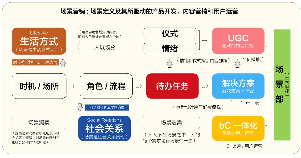 “待办任务”理论否定了需求在营销中的地位,这等于掀了传统营销理论的天灵盖。 什么是场景? 我研究了大量从营销角度讲场景的描述,大致有两个角度:一是时间/场所,这是功能性角度,很容易进入细分逻辑,从而与现代营销逻辑兼容,把场景营销视为用户导向营销的一个分支;二是情景营销(Contextual Marketing),这是情绪性角度,非常符合当下互联网情绪消费的热点。功能性角度的场景,是场景营销的入门证;情绪营销角度的场景,是场景营销的高潮。而场景营销的核心,恰恰不是这两个角度。 年初,场景营销研究院提出了一个迄今为止最为完整的场景营销框架图,提出了场景的三大模块、六大因素。分别是:时间/场所、角色/流程、情绪/仪式感。时间/场所反映了场景是生活方式的切片,角色/流程反映了场景是社会关系的具现,情绪/仪式感反映了场景消费的社会价值和意义。 一个完整的场景,三大模块、六大因素缺一不可。三大模块,分别反映了场景的功能性、社会性和情绪性。 “待办任务”理论的精妙与局限 聊场景营销,离不开待办任务。而聊待办任务,离不开哈佛商学院教授克莱顿·克里斯坦森。 与运气竞争?传统营销的软肋 克里斯坦森提出“待办任务”这一理论的第一本书是《与运气竞争:关于创新与用户选择》(以下简称《与运气竞争》)。相比为克里斯坦森博得大名的《创新者的窘境》,《与运气竞争》有点小众,所以再版后改名为《创新者的任务》。