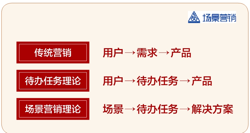 看到这里,是不是有点虎头蛇尾的沮丧?这5种方法,仍然逃脱不了猜猜猜,需要有点福尔摩斯般的技能,不是显性的因果关系,没有像样的发现待办任务的方法论。 读完这本书,我的感觉就是:有惊喜,有沮丧;有突破,有局限。 惊喜之处,一是它戳到了传统用户需求逻辑的痛处,太精准了,这是传统营销的用户需求理论无解的痛处;二是待办任务面对需求理论简直就是站在高处降维打击,建立了营销中的因果关系。 沮丧之处,就是逻辑不完整。“待办任务→产品”的逻辑是完整的,但待办任务从何而来?不完整,有点敷衍了事,草草结尾。原来以为待办任务理论掀了传统营销理论的天灵盖,结果掀了一半又盖上了。 但是,待办任务的理论体系激发了我。我觉得以下两点在场景营销体系中是有发展空间的: 第一,把待办任务理论,从产品创新扩展到场景营销。克里斯坦森的待办任务理论,仍然沿袭了用户导向的思维,而场景营销就从用户思维里跳出来了。这样的话,待办任务就只是场景营销中的一个环节。 传统营销:用户→需求→产品 待办任务理论:用户→待办任务→产品 场景营销理论:场景→待办任务→解决方案 第二,建立场景与待办任务之间的因果关系。待办任务理论建立了待办任务与产品创新之间的逻辑关系,而场景营销可以建立场景与待办任务之间的逻辑关系。这样的话,就可以建立场景营销全链(场景→待办任务→解决方案)的因果关系。如果做到这一点,将会是重大突破。 场景中的结构化用户与角色:不同用户的趋同消费 接着来看场景中用户的角色,以及角色对待办任务的影响。 场景案例分析 场景案例1:一个孕妇想吃冰淇淋,瞒着家人偷偷买了吃,被丈夫发现了,很尴尬。 场景分析:如果是一名未婚女性,爱吃冰淇淋,只要不怕胖,想吃就吃。特别是在恋爱期间,未婚夫宠着,想吃赶紧买。但是,一旦怀孕,消费就受到另一个角色的约束——未出生的婴儿,而且这个约束还有第三方监督方——老公及家人。不管是“90后”还是“00后”,也不管是南方人还是北方人,孕妇的消费已经不完全属于自己了。 场景案例2:2023年8月,网上流传有一条社会新闻,叫作“‘00后’安排商务宴请,董事长当场石化”。作为公司行政秘书的“00后”,带着一群领导和客人去吃蜀大侠。看着桌上各式配菜、料碟和翻滚的红汤锅底,听着邻桌人声鼎沸,大家涮得热火朝天,穿着火锅围裙的董事长和客人们面面相觑,哭笑不得。 场景分析:“00后”朋友之间请吃火锅,没问题。领导跟家人、亲友聚餐,或者带公司员工聚会吃火锅,也没问题。但是,商务宴请就不合适。吃什么、在哪里吃,不是由个人喜好决定的,而是由角色和关系决定的。商务宴请,是甲乙方关系。这里要考虑:1.待办任务,即宴请的目的;2.角色关系,最重要的当然是甲方客人的偏好,以及甲方客人与董事长的关系。商务宴请,是典型的结构化用户场景,个人的偏好让位于商务宴请里的角色关系,而且大概率会向甲方主宾的偏好靠拢。 消费的社会性 一个人的消费,受到两方面的影响: 一是个人偏好和消费能力、消费意愿的影响。用户导向的营销,正是基于这个消费逻辑建立的。其基本逻辑是:用户调研→用户细分→目标用户及需求→定位→4P(产品、价格、渠道、促销)策略→执行→控制(管理),这就是科特勒营销理论的基本框架。简而言之,就是“用户→需求→产品”的用户逻辑思维模式。 二是所在场景及场景中群体的影响。场景怎么对个人消费产生影响呢?这就涉及场景营销的三大模块、六大因素。第一模块是时间/场所。都是吃饭,早中晚餐各有不同,这是生活方式。第二模块是角色/流程。同样是一群人去吃饭,商务宴请只能吃一样的饭,但每个人的角色不同,对消费的影响也不同;南方与北方餐饮文化不同,一顿饭的消费流程也就不同。第三个模块是情绪/仪式感。克里斯坦森认为,待办任务有“功能性、社会性、情绪性”三个维度。 一直以来,“个性化”都是营销领域的“政治正确”,但是最成功的营销却是“你用我也用,你买我也买”,甚至互联网带给我们的不是更加个性化,而是更加从众。 我的理解是,“随大众”有两类:一类是刚性的随大众,是场景的软约束,乃至硬约束,比如商务宴请;另一类是心理上追求归属感的从众。为什么个人消费要从众?因为消费有社会性。人类之所以成为人类,就是人类的社会性。家庭、公司、社区、朋友、同学……都是人的社会性的体现。 所以,个人的消费没有真正意义上的个人性,而会带上社会性的痕迹。消费的社会性,总体上趋向消费的一致性。消费的一致性,有的是硬约束,比如,办公室午餐,如果是点外卖,可能同事之间没有一致性,各点各的外卖;如果是集体聚餐,就有一致性,但可能会考虑每个人的偏好,这是软约束;如果是集中安排的工作餐,就只能听凭统一安排了,这是硬约束。 用户逻辑的营销,强调相似用户需求的相似性。场景逻辑的营销,强调不同用户在相同场景消费的趋同性。 场景用户的结构化 说一个最熟悉的场景——北方宴请。角色分配一目了然。 场景营销研究院把角色/流程归为一个模块,因为角色与流程是一对。角色确定了,流程也就确定了。 针对当下白酒行业流行的品鉴会(或沉浸式体验),新营销专家团提出了一个相对标准的品鉴人员构成:1KOL(关键意见领袖)+2KO C(关键意见消费者)+3大 C(消费
