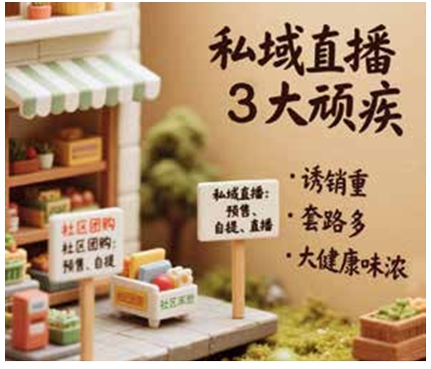 私域直播通过塑造商品价值、产地溯源直播等方式,提升商品的附加值,使其能够以更高的价格销售。社区团购也可以对现有商品进行价值挖掘和包装,提高商品的品质感和独特性,从而实现高毛利销售。 6.企业精细化管理 私域直播想成功,要有一支由主播、策划、运营、技术支持等人员组成的专业团队。社区团购可以学习这种专业分工模式,组建包括采购、销售、客服、物流等人员在内的专业团队,明确各岗位的职责,提高工作效率和专业水平。 私域直播企业通过精细化的管理流程,确保直播活动的顺利进行和运营效果的提升。社区团购可以优化内部管理流程,加强各部门之间的协同合作,提高决策效率和执行力,实现精细化管理。 7.增强用户黏性 私域直播通过及时回应用户的问题和需求,提供个性化的服务,提高了用户的忠诚度,增强了用户黏性。社区团购可以加强客服团队建设,提高客服人员的专业素质和服务水平。 社区团购与私域直播虽然同属私域流量运营范畴,但两者的逻辑存在差异:社区团购以“价格+社交裂变”为核心,而私域直播更强调“内容+互动+即时转化”。因此,社区团购向“私域直播化”进化,在底层逻辑方面,要从“流量收割”转向“用户关系深耕”,通过内容与互动提升 LTV(用户生命周期价值);在执行路径方面,要遵循“工具迭代(直播化)→价值重构(内容化)→效率升级(数字化)→组织适配(精细化)”;在规避风险方面,不能盲目照搬私域直播形式,而要结合社区团购的“半熟人社交”属性,设计轻量化、易复制的运营模式(如团长 IP化、社群直播联播)。 私域直播的“病”,社区团购来治 硬折扣专家连杰曾说:“预售比现售要牛,自提比快递要牛,直播比图文要牛。”按照这个观点,“三牛”,私域直播全面占据,社区团购只占了其中两个。那是否私域直播就比社区团购厉害了呢?答案是:未必。 私域直播的“三牛”本质上源自互联网基因的延伸:直播即时互动性突破图文展示局限(转化率提升30%—50%),预售机制实现轻资产运营(库存周转率提升2—3倍),自提模式节省“最后一公里”成本(履约成本降低40%)。 社区团购的“两牛”则源自线下基因的进化:厂家直配体系支撑生鲜高频消费(损耗率控制在3%以内),团长裂变构建低成本获客网络(获客成本低至<10元/人)。 目前,私域直播存在3大顽疾:诱销重、套路多与大健康味浓。