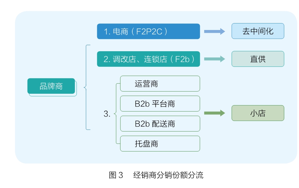 图2 零售商引领供应链革命销商深度分销阶段。 上述三个阶段,其实是渠道商小型化的过程。正因为渠道商小型化,品牌商通过深度分销获得了全面掌握渠道的资格,进而能够把中国弱小的经销商和分散的零售商组织起来。这是有巨大历史贡献的。 然而,从电商开始,本来就弱小的经销商的分销份额逐渐被分流,未来的流量将逐渐枯竭(见图3)。 第一,电商分流。目前,电商在中国实物零售的占比不到30%,一线快消品的电商份额约为10%。2025年,因为品牌商遇到线下困境,一线品牌纷纷加大线上投入,电商份额会继续扩大。 我将电商模式称为 F2P2C。 F指厂家;P指平台,是新型中间商;C指消费者。 第二,零售商直供分流。胖东来调改店、休闲零食硬折扣店,以及其他连锁店,这些越来越多的“厂店直供”,绕过了经销商。这是不可逆的大趋势。胖东来调改店的风刮到哪里,哪里就会有大量经销商放弃代理。