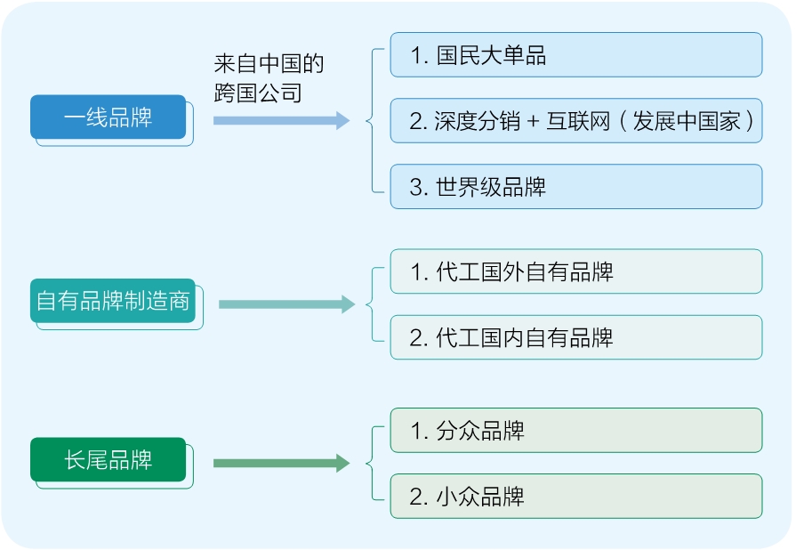 第三, B2b平台分流份额。 B指经销商, b指零售商。10年前开始的巨头 B2B失败了,但区域 B2b又崛起了。目前大约占10%的分销份额。我预测,当 B2b平台占据30%的分销份额时,经销商将在渠道体系整体崩盘。B2b平台覆盖的夫妻小店,未来将以连锁加盟的方式加盟 B2b平台,B2b平台未来不仅是订单平台、城配平台,还将是自有品牌平台。没有自有品牌的门店,就没有溢价能力。 试想一下,经过层层分流,经销商的分销份额还有多少?还支撑得起目前的人员、仓储、配送吗? 按照分流后的分销规模,经销商目前以商贸赚差价的模式越来越难以行得通。不过,目前品牌商面临困境,在零售商整体倾向直供模式的形势下,非常需要争取经销商作为同盟者,否则,品牌商的地位难保。 品牌商的同盟商这个角色,我认为将是运营商。运营商站位品牌商,依托曾经拥有的 b端客情,触达C端用户,并开始运营用户。正是用户运营能力的存在,确保了品牌商未来拥有直供的资格。 品牌商直供的前提,就是通过运营用户,从而“挟用户以令零售商”,进而获得直供的资格。 作为分销商,属于经销商的地盘逐步被分流,这是无法阻挡的大势;作为运营商,品牌商需要它的存在,否则其将在快消品商业生态中失去地位。 经销商如果有实力,可以冲一冲 B2b平台;如果没有实力,安心做一个运营商也不错。 品牌商的广阔天地在海外 中国快消品本土企业在早期的发展过程中,以一国市场之力托起了世界级规模的企业。这是国家改革开放和中国式营销的红利。但是,如果头部企业患上了对国内市场过于依赖的病,说难听点是没有出息的。 除了家电行业外,中国消费品巨头太“内向”了。中国快消品目前的缩量时代,其实是工业文明进入成熟期的必然现象。中国目前普遍的“三高”甚至“六高”疾病,其实大多是长期过量消费的结果。 增量、过量、缩量,这是中国快消品消费规模的三个阶段。因为有过量,所以才有缩量。不能完全归罪于大环境。 快消品一线品牌,在零售商主导的商业生态体系中,份额会大大降低。厂店直供,只卖国民大单品,导购退出终端,一线品牌曾经的营销抓手将丧失殆尽,必须经历深刻的转型。 我把未来的品牌商(制造商)分为三类(见图4): 第一类:拥有国民大单品的一线品牌 商超调改后的“宽类窄品”策略,品牌商的 SKU大大缩减。一线品牌凭借庞大的 SKU数,占据商超巨大的排面,然后依靠导购引导消费者购买的时代已经过去。但是,零售商仍然需要国民品牌的大单品。国民大单品仍然是零售商引流的重要筹码。即使在欧美等工业文明非常成熟的地区也是如此。 那么,什么是国民大单品呢?就是不论消费者收入高低,都欢迎的产品,甚至跨越国界受到普遍欢迎的产品。国民大单品对应用户的最大公约数。如现在中国市场的跨国公司品牌,基本上都是国民大单品。 过去,销量最大的产品可能是金字塔底的产品,未来销量呈橄榄型分布,低端和高端的份额都比较低,销量最大的就是居于中间地带的国民大单品。 过去,中国企业的产品一直在快速升级,国民大单品没有定型的时机。现在,中国已经进入工业文明成熟期,产品升级过程将逐步完成。 这是国民大单品的定型时机,千载难逢。机不可失,时不再来。 我与部分一线品牌负责人交流过,从价格带上看,中国的国民大单品可能稍高于跨国公司。中国的一线品牌一定要利用目前商超调改的时机,真正打造奠定未来百年基业的国民大单品。 国内市场缩量不可怕,另一扇大门正在打开。中国一线品牌正在迎来成为跨国公司的最佳时机。 一直以来,跨国公司基本上源自欧洲、美国、日本等老牌发达地区,后来居上的只有韩国等少数国家。如果跨国公司收缩回它们的本土,它们就不再有世界级的规模。 中国经济的快速发展已经到了一个临界点,鉴于中国国家品牌的世界地位,我们具备了诞生来自中国的跨国公司的机会。 品牌是心理上的仰视。我们过去那么追捧西方品牌,源于心理上的仰视。现在有了民族品牌自信,所以不再仰视。 中国的经济规模、中国经济在全世界的渗透力,以及中国在世界话语体系中的地位等,都决定了中国不再仅仅出口产品,还可以出口带品牌标签的品牌溢价。 这同样是千载难逢的机会! 是品牌出海,而不是产品出口。出海是营销能力出海。 对于发展中国家,我们完全可以借助自身擅长的深度分销模式,以及互联网工具,把发达国家落后的渠道商和零售商组织起来;对于发达国家,我们可以借助中国的金融实力收购西方品牌,或者像华为一样创造中国的世界级品牌。 一线品牌,最大的市场在世界。中国只是进入世界的起跑线。 中国以一国市场之力培养了世界级规模的企业,而进入国际市场,也将成为世界品牌 Top100。 第二类:代工的制造商 中国成为世界工厂,除了一线品牌的生产制造外,还有跨国公司在中国设厂,以及中国企业为西方零售商的自有品牌代工。 只要有自有品牌,一定有相对应的代工厂。甚至未来供应商的产品,也是代工厂生产的。 第三类:缺乏规模的分众、小众企业 做规模需要时机。那些已经丧失了在中国做大规模机会的企业,在世界其他地方也很难再找到像中国这样足以批量培养世界级规模企业的机会。过去,中小企业总是生存在低端,处于主流市场的边缘地带。