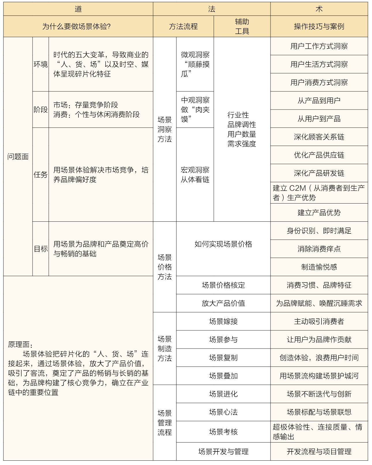 我们要学会把整个体验场景拍摄下来,一是不断观摩,发现哪些细节做得不到位,以便下次优化;二是将这些资料做成影集放在柜台里、做成小视频存放在员工的手机里,便于向潜在目标客户展示和传播。同时,把每次发生的场景活动,精简成15秒、30秒的短视频,在微信、抖音等平台上进行二次传播。 表1 场景方法论的道、法、术汇总表