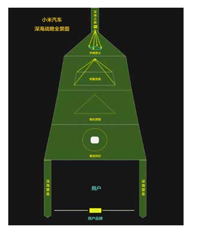 综上,小米汽车重新定义汽车赛道、智能汽车、汽车品类、对标汽车、造车逻辑、渠道模式、汽车用户等概念及意义,锁定“人车家移动智能空间”这个1%的“深海之眼”,奠定了深海战略的认知基础。