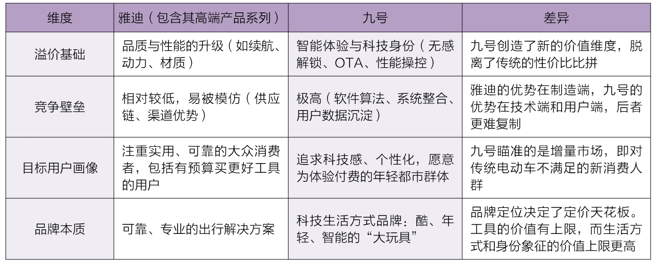 这一战略的基石,也源于其深厚的科技基因与独特的品牌资产。九号虽出身小米生态链,但其核心竞争力关键来自对赛格威的收购——此举不仅为其注入了成熟的平衡控制技术与机器人研发能力,更为其带来了国际化的品牌视野。这种源自“智能短交通”先驱的“技术血统”,构成了传统品牌难以复制的核心资产,也为九号贴上了鲜明的“科技”标签。 在此基础上,可以清晰地回答一个关键问题:为何雅迪虽定位“更高端的电动车”,其品牌溢价能力却不及九号?根本原因在于二者价值基础的本质不同(见表1)。 雅迪的高端化路径是“品质与性能的升级”,其价值仍构建于“更卓越的交通工具”之上。无论是冠能系列强调的超长续航、强劲动力,还是更精良的制造工艺,本质上都是在传统电动车的价值维度上进行升维竞争。消费者为此支付的溢价,对应的是更可靠、更出色的实用功能。然而,这类功能优势易被模仿甚至超越,一旦陷入“电池大战”“电机竞赛”的参数内卷,最终仍可能回归价格战的泥潭。
