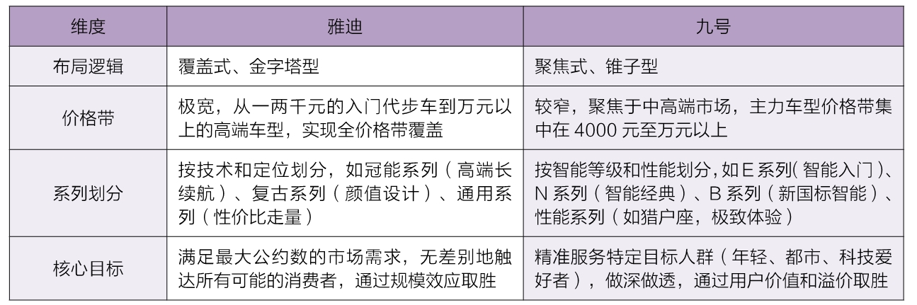 1.产品线战略:规模覆盖与圈层深耕的路径差异 基于不同的品牌定位,二者在产品线布局上形成鲜明的对比(见表2)。雅迪构建的是“金字塔型全客层覆盖”体系,从基础代步车到高端旗舰车型,力求满足不同价格敏感度、不同使用场景的用户需求,以宽度换取规模效应;九号则采取“锥子型精准穿透”策略,聚焦中高端市场,围绕都市年轻科技群体进行深度渗透,以产品体验的锐度构建用户忠诚度与溢价基础。
