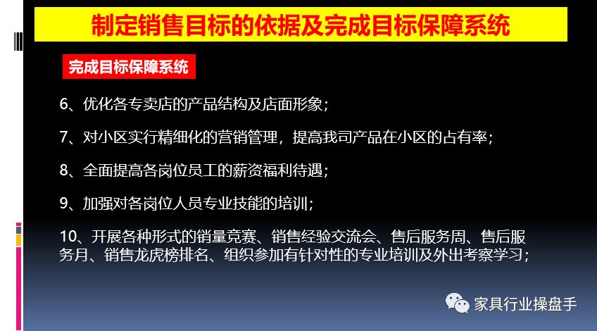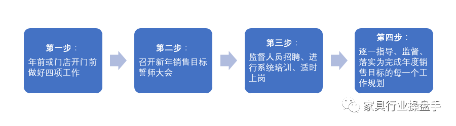 当然每一项工作都需要有时间节点和细节。上图仅用于说明家具门店的老板要有年度的系统思维和规划。而不是走一步算一步。这样的规划,一定要在全体员工大会上做详细的说明。也是老板对员工的一种承诺表现形式。做好这项工作异常关键。既能统一大家的思想也能鼓舞全体员工的士气。