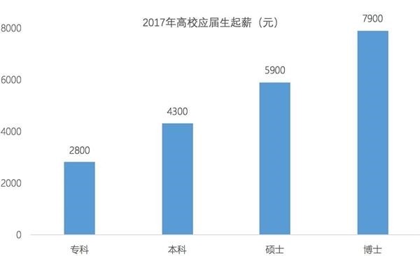 报告显示,大专、本科、硕士、博士的平均起薪分别是2800元、4300元、5900元、7900元,博士的起薪属于中级白领薪资水平,大专、本科、硕士的起薪则普工以下薪资水平。