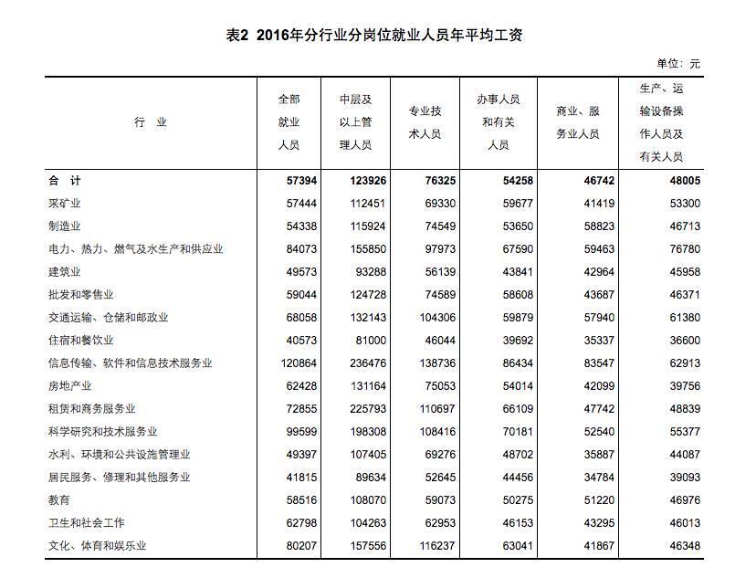 2016年行业岗位就业人员平均工资,来自@国家统计局官网
