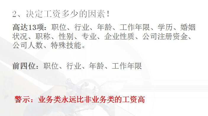 决定工资多少的因素,前五位:职位、行业、年龄、工作年限、学历,年龄和工作年限没有必然关系,排在第一的职位,则与技能能力有直接的关系,所以首先拷问自己“是否拥有一门能力?,包括管理能力,如果没有,请回去思考并作出行动”。