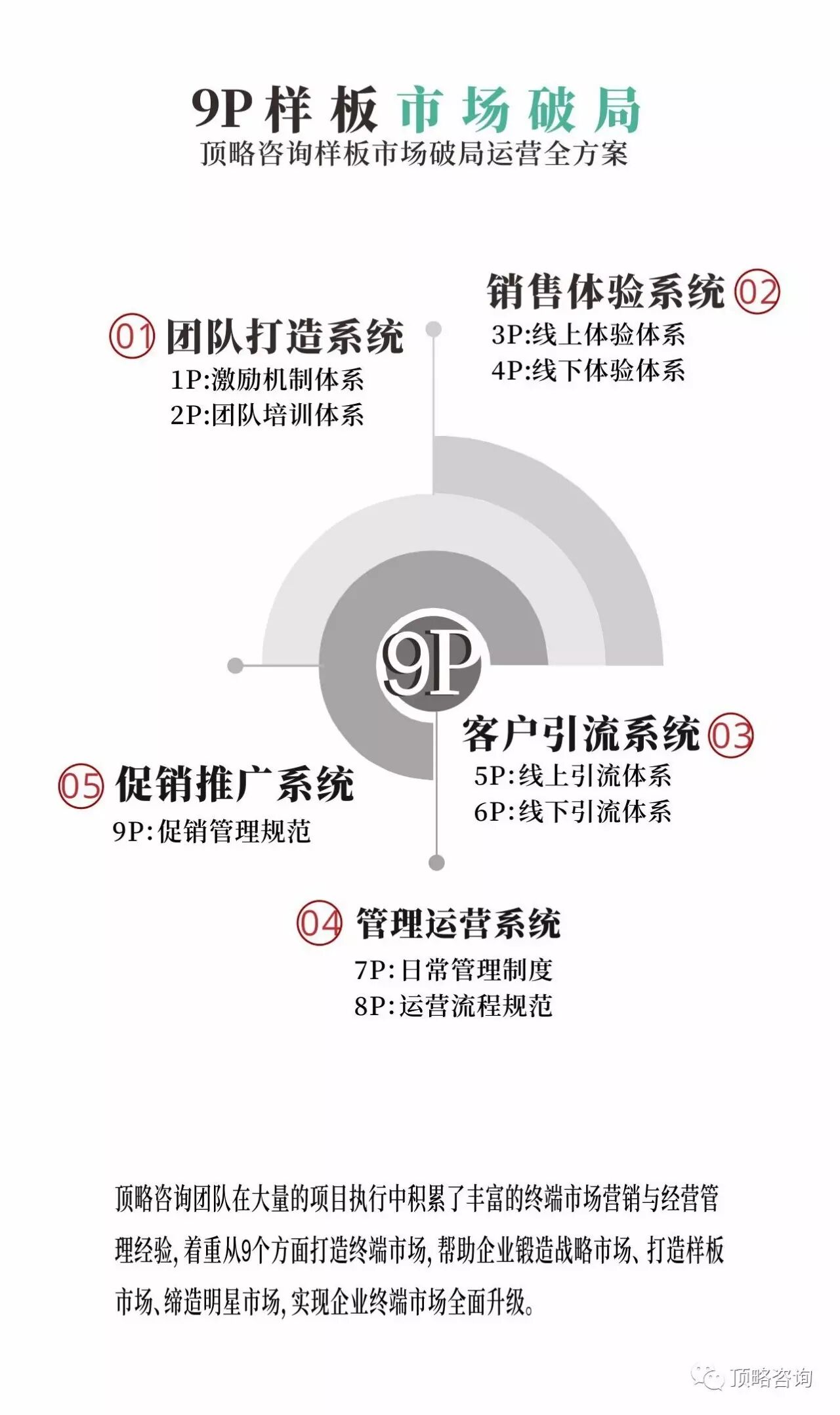 在经营大市场的过程中,传统渠道占位不占优势,完全可以通过布局创新来解决这个问题;优势渠道布局是一城多店,一店一商圈或一类群体的搞法,这种方法到现在也是非常有效的;但对于没有渠道占位能力的品牌来讲,通过开一店搞定一城市的布局模式也是一条可以尝试的路。说的这里大家不要走入误区,认为只要开一个店就行了。前提的我们得有全渠道引流的能力,还有终端经营创新的能力,这个在顶略咨询的《9P样板市场破局》中有这方面的运营方法:体验前置、导购前置、设计前置、服务前置。