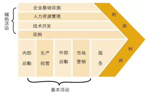 第三个关键词是“价值链”:这是判定和塑造竞争优势最基本的工具,它将企业划分为产品的设计、生产、营销和分销等相互独立的活动。
