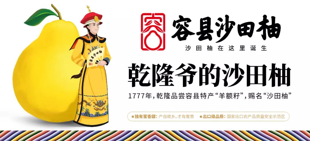 柚子以容县沙田柚最负盛名,虽然广东福建重庆等地大量引种种植,但味道还属原产地容县沙田柚,独有蜜香、入口无渣,深受消费者青睐,成为柚中之皇。并在1777年被乾隆皇帝赐名。福来咨询以此为容县沙田柚创作了品牌图腾和口令。