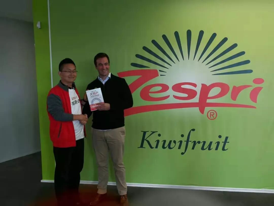 神农岛首席顾问、中国人民大学品牌农业课题组组长、福来咨询董事长娄向鹏访问新西兰佳沛奇异果总部,向对外关系总监Michael Fox赠送《大特产》。