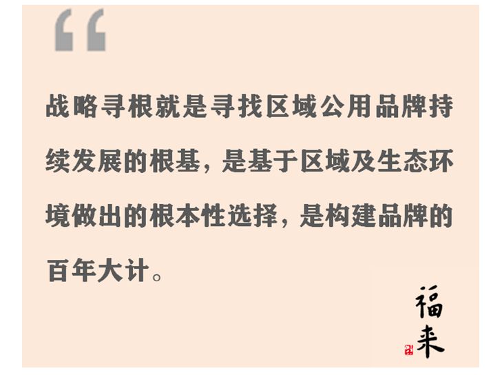 战略的本质是寻根,根深则叶茂,没有根的战略,做不强,做不大。战略寻根就是寻找区域公用品牌持续发展的根基,是基于区域及生态环境做出的根本性选择,是构建品牌的百年大计。