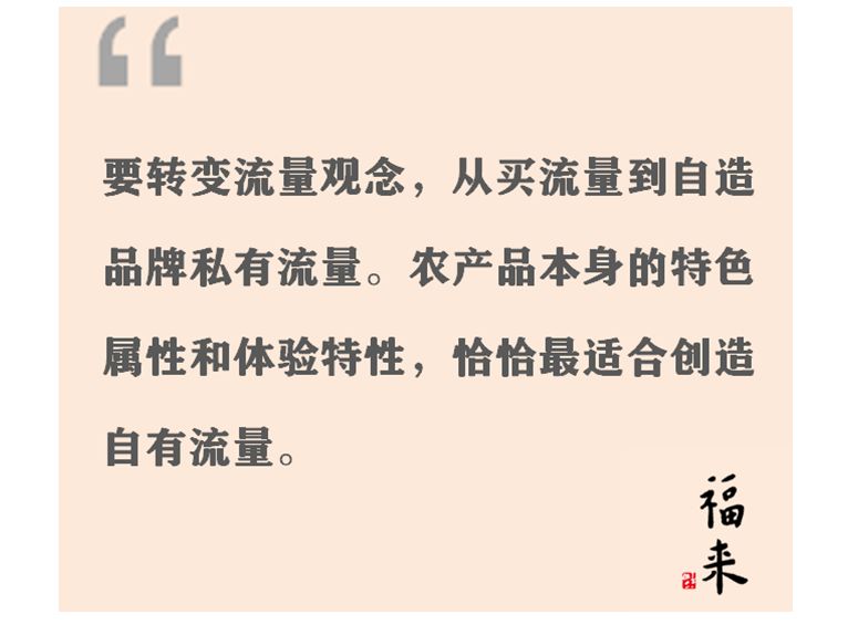 过去企业花钱买流量,现在行不通了。当流量越来越贵,地方政府也没有更多资源去买。福来咨询认为,要转变流量观念,从买流量到自造品牌私有流量。农产品本身的特色属性和体验特性,恰恰最适合创造自有流量。