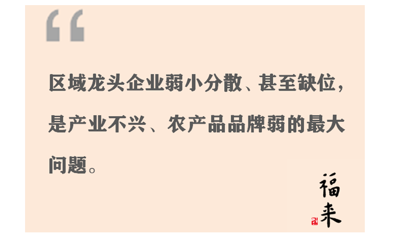 福来咨询研究农业产业规律发现,区域龙头企业弱小分散、甚至缺位,是产业不兴、农产品品牌弱的最大问题。就是说,产业要兴旺,品牌要强大,首先要有品牌产权明晰、善于市场经营的企业法人主体,一个整合了中小企业、合作社、家庭农场、农户利益的联合体企业!