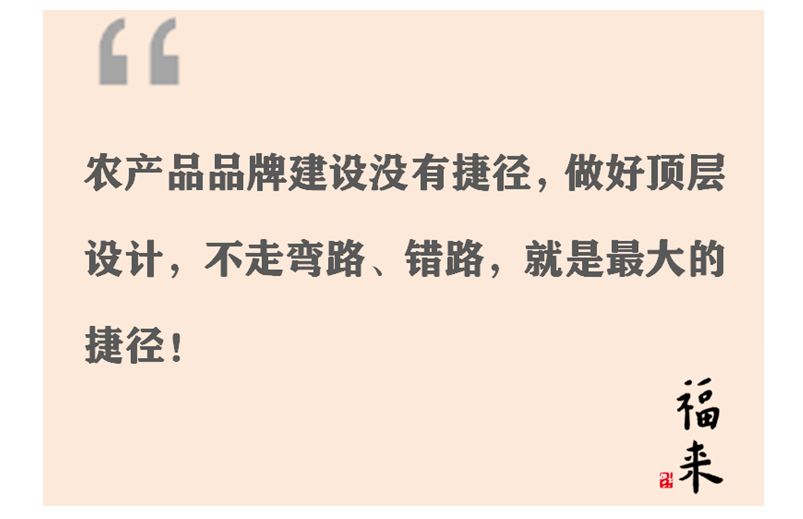 福来咨询强调,农产品品牌建设没有捷径,做好顶层设计,不走弯路、错路,就是最大的捷径!“双轮驱动、三级联动”,是政府和企业各司其责,互为支撑,形成合力,以省级为平台,县市为抓手,上下协力,点面结合,最符合我国国情的农产品品牌建设之道。