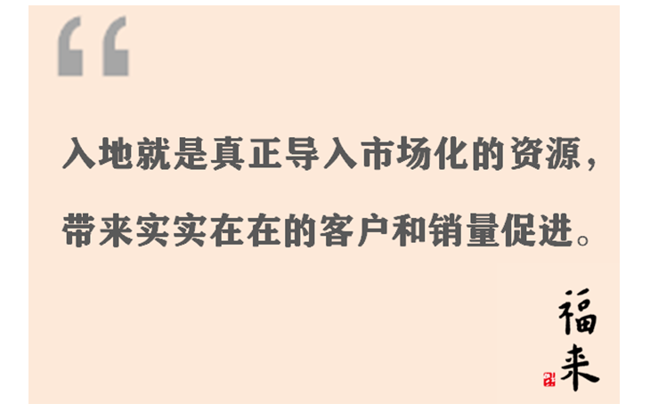 入地就是真正导入市场化的资源,做好与目标市场对接、与客户对接,与渠道对接、与终端对接,BTB业务对接,带来实实在在的客户和销量促进。