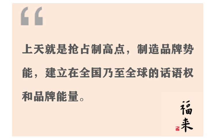 上天就是抢占制高点,制造品牌势能,以更高的格局和视野,保证品牌及产业发展有大占位、大平台、大声音,建立在全国乃至全球的话语权和品牌能量。