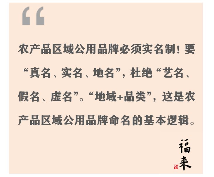 区域公用品牌建设,从命名规范化开始。福来咨询强烈倡议:农产品区域公用品牌必须实名制!要“真名、实名、地名”,杜绝“艺名、假名、虚名”。“地域+品类”,这是农产品区域公用品牌命名的基本逻辑。