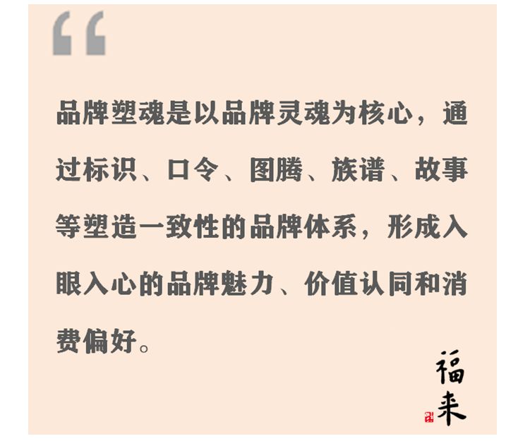 品牌塑魂是以品牌灵魂为核心,通过标识、口令、图腾、族谱、故事等塑造一致性的品牌体系,形成入眼入心的品牌魅力、价值认同和消费偏好。这是做品牌的基本逻辑。