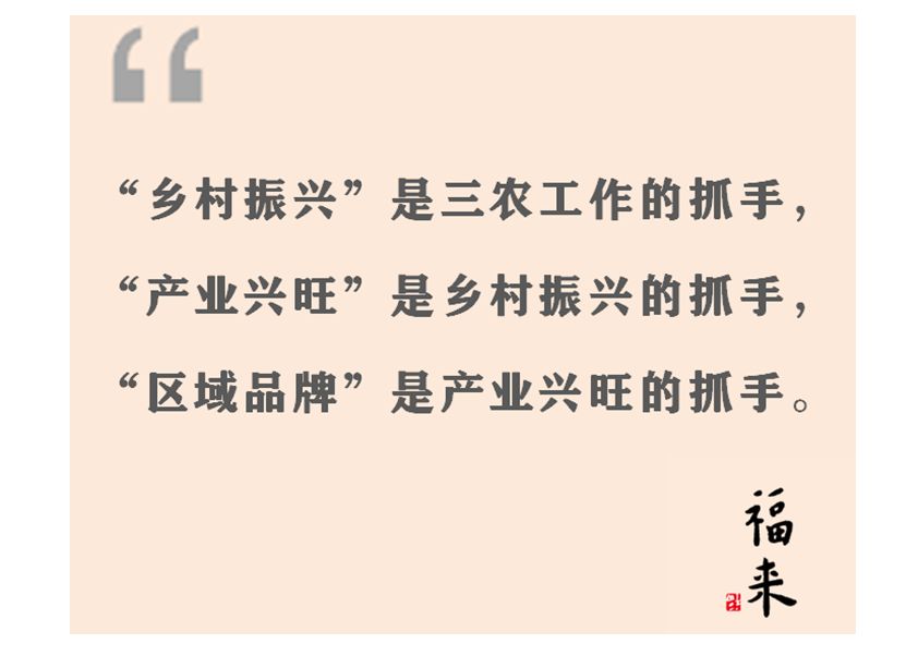 北京福来咨询总结了“三个抓手”:“乡村振兴”是三农工作的抓手,“产业兴旺”是乡村振兴的抓手,“区域品牌”是产业兴旺的抓手。