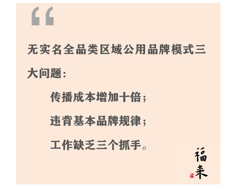 这种没有品类指向、甚至没有区域名称的品牌,福来咨询称为无实名全品类区域公用品牌模式。这种做法主要存在三大问题: