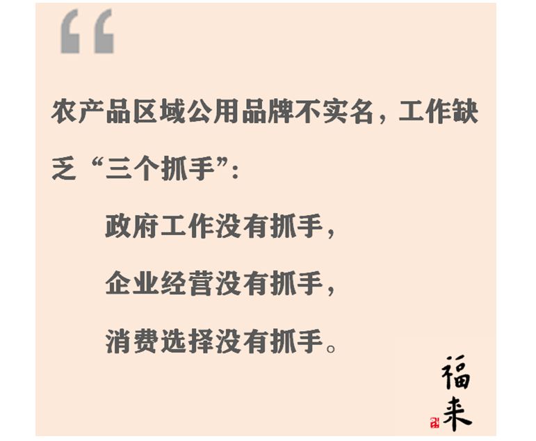 问题三,工作缺乏三个抓手。农产品区域公用品牌不实名,工作缺乏“三个抓手”,即:政府工作没有抓手,企业经营没有抓手,消费选择没有抓手。