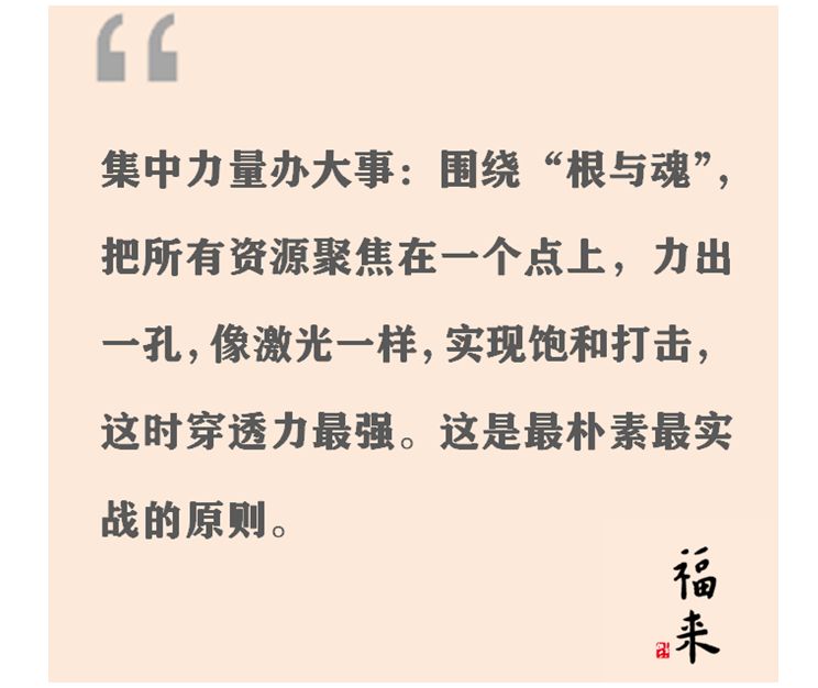 在区域公用品牌传播推广上,政府能够投入的人财物资源总是有限的。还要有影响力和效果,怎么办?福来咨询主张要集中力量办大事:围绕“根与魂”,把所有资源聚焦在一个点上,力出一孔,像激光一样,实现饱和打击,这时穿透力最强。这是最朴素最实战的原则。李小龙有一句名言;我不怕会一万种腿法的人,我怕把一种腿法练一万遍的人。