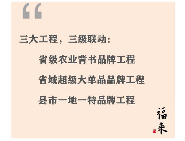 福来咨询认为,必须做好三大工程,实现三级联动。即:省级农业背书品牌工程、省域超级大单品品牌工程、县市一地一特品牌工程。