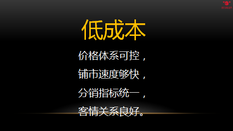 3、低成本的特点是:价格体系可控,铺市速度够快,分销指标统一,客情良好(业务员废了网络不能废!)。