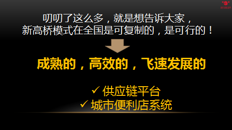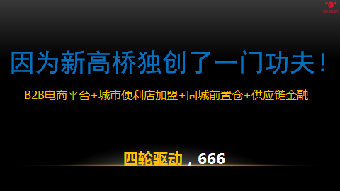 最后,通过今天与大家交流的新视野,新通路,新双赢这三个方面的交流,从生意的抓手的演变,到新高桥平台成熟化高速发展的演进,到合作模式的介绍,希望大家多了解新高桥,多支持新高桥,根据新高桥的模式的特点定制合作方案,一起达到赚钱,双赢!