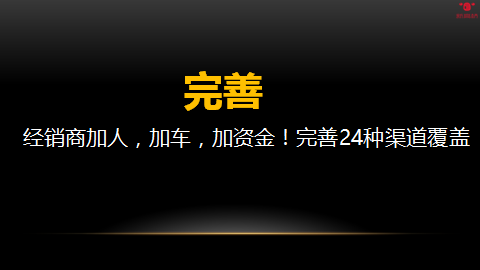 可乐有24种渠道覆盖,我司虽做不到,但至少要保证4种以上渠道覆盖,潜台词就是经销商加人,加车,加资金!